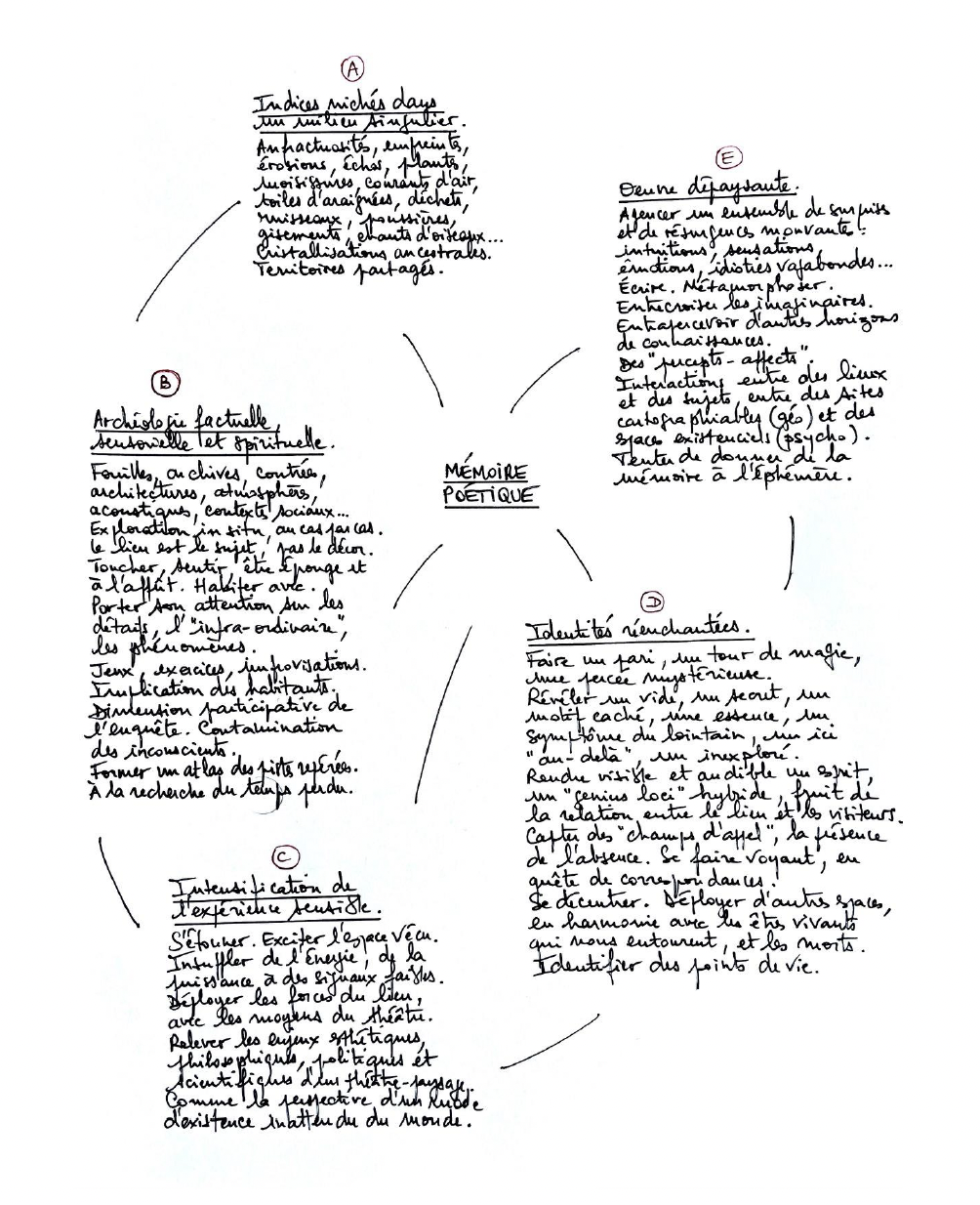 C’est en passant du temps in situ, en étudiant l’architecture et l’acoustique d’un bâtiment, en y menant toutes sortes de fouilles et d’improvisations, en mêlant inconscients et imaginaires avec les habitants que nous éprouvons un lieu. De cette manière, nous tentons de faire émerger des forces enfouies puis de révéler, par l’écriture au plateau, une autre forme de mémoire, sensible et source de dépaysement.