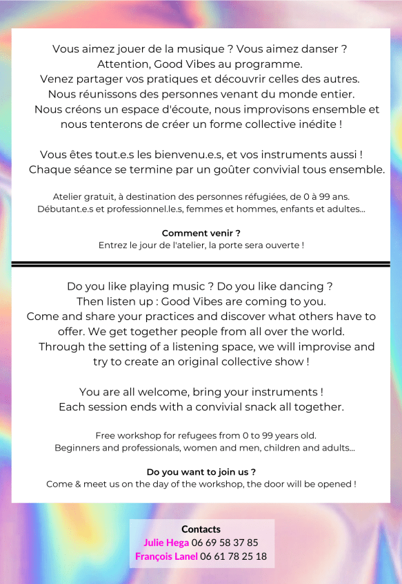 Destiné aux personnes exilées, âgées de 0 à 99 ans, ce projet a pour objet de créer des temps d’échanges grâce à la musique et à la danse. Tout sera construit ensemble, à partir des origines géographiques, des pratiques et des désirs de chacun. Les participants pourront partager leurs musiques, leurs langues, leurs instruments et les danses qui les façonnent. Ces rendez-vous seront dédiés à la mise en commun de toutes ces identités artistiques. Chaque séance se fera à partir des personnes présentes et autour de leurs propositions actives. Ces laboratoires artistiques ont pour vocation de créer des espaces inclusifs par l’art et de valoriser les singularités culturelles de chaque participant. Il s’agit de donner à tout le monde la possibilité d’exprimer publiquement ce qu’il est, au cœur d’un processus collectif, et de rendre visible des talents individuels.