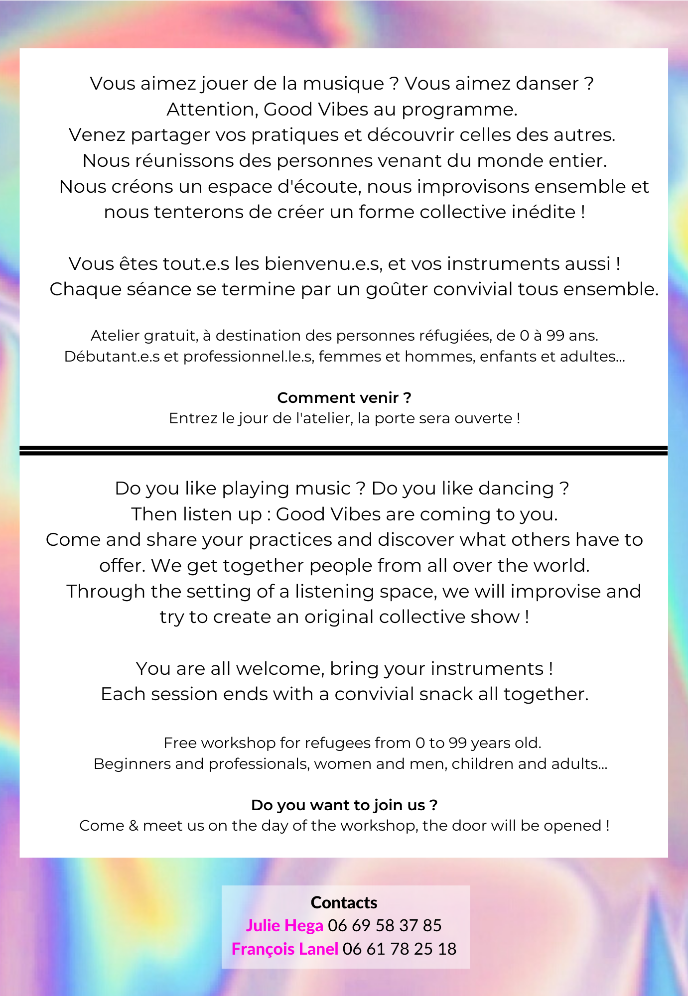 Destiné aux personnes exilées, âgées de 0 à 99 ans, ce projet a pour objet de créer des temps d’échanges grâce à la musique et à la danse. Tout sera construit ensemble, à partir des origines géographiques, des pratiques et des désirs de chacun. Les participants pourront partager leurs musiques, leurs langues, leurs instruments et les danses qui les façonnent. Ces rendez-vous seront dédiés à la mise en commun de toutes ces identités artistiques. Chaque séance se fera à partir des personnes présentes et autour de leurs propositions actives. Ces laboratoires artistiques ont pour vocation de créer des espaces inclusifs par l’art et de valoriser les singularités culturelles de chaque participant. Il s’agit de donner à tout le monde la possibilité d’exprimer publiquement ce qu’il est, au cœur d’un processus collectif, et de rendre visible des talents individuels.